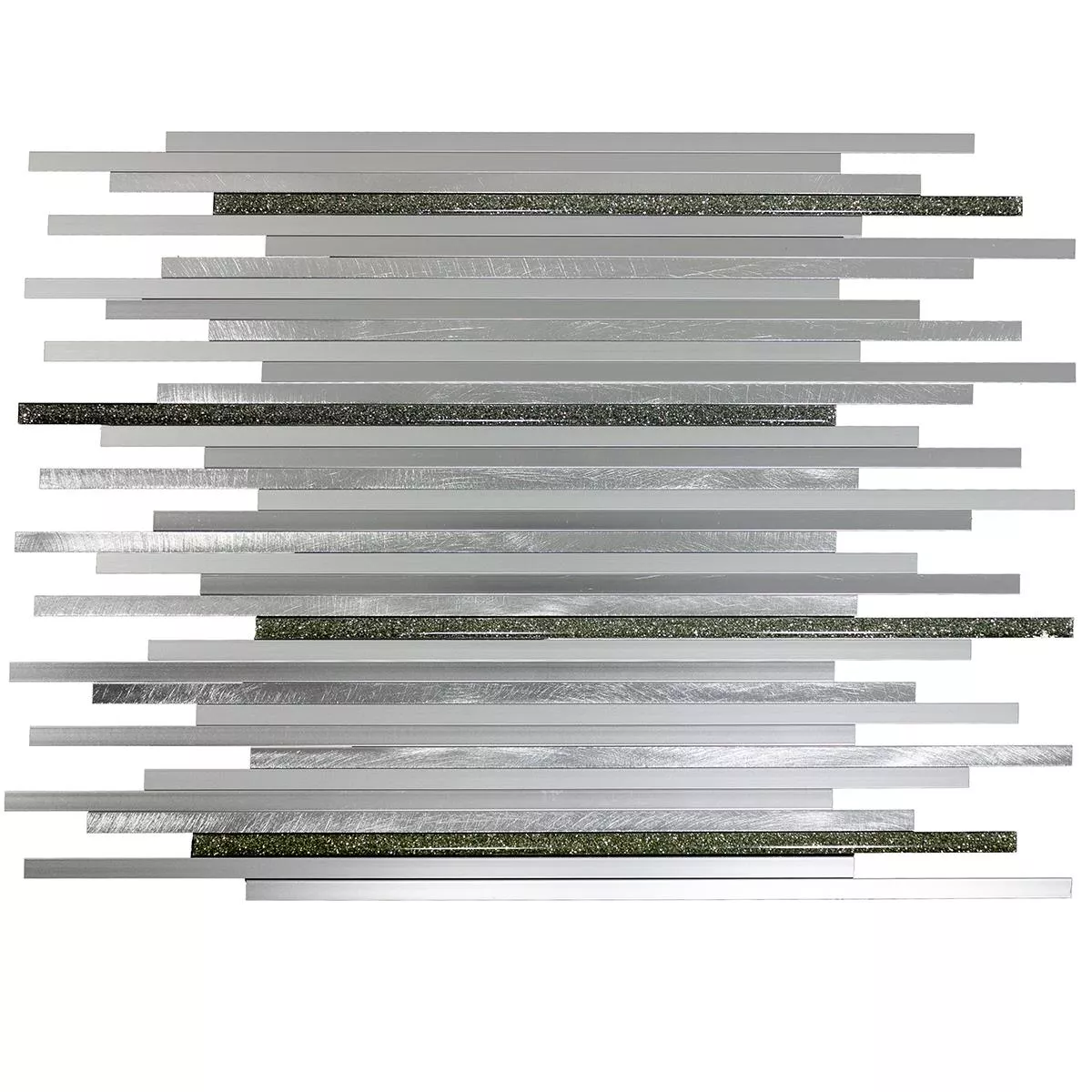 The aluminum metal mosaic tiles Bilbao in stick shape gives your interior a contemporary aesthetic. With a surface in a brushed metal look and a matt texture, they radiate elegance. The silver color and the stone size of 7.5x300mm offer unique accents.