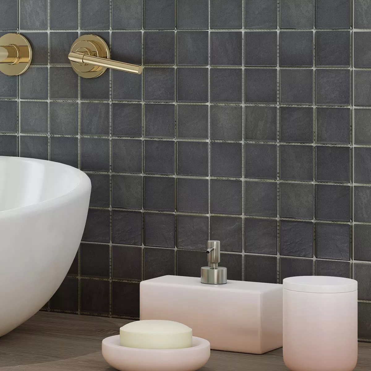 The Palazzia ceramic mosaic tile in elegant anthracite combines modern design with high functionality. Its matt surface and authentic stone look create a stylish and contemporary ambience that can be perfectly integrated into various room concepts. The tiles are glued to a net on a practical 29.7 x 29.7 cm mat, making installation simple and precise.
