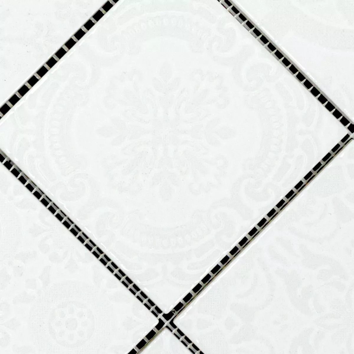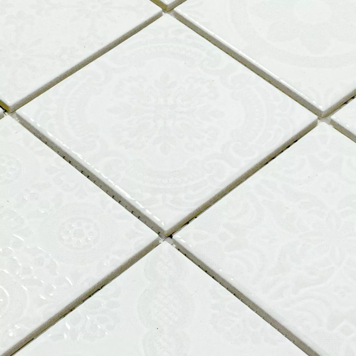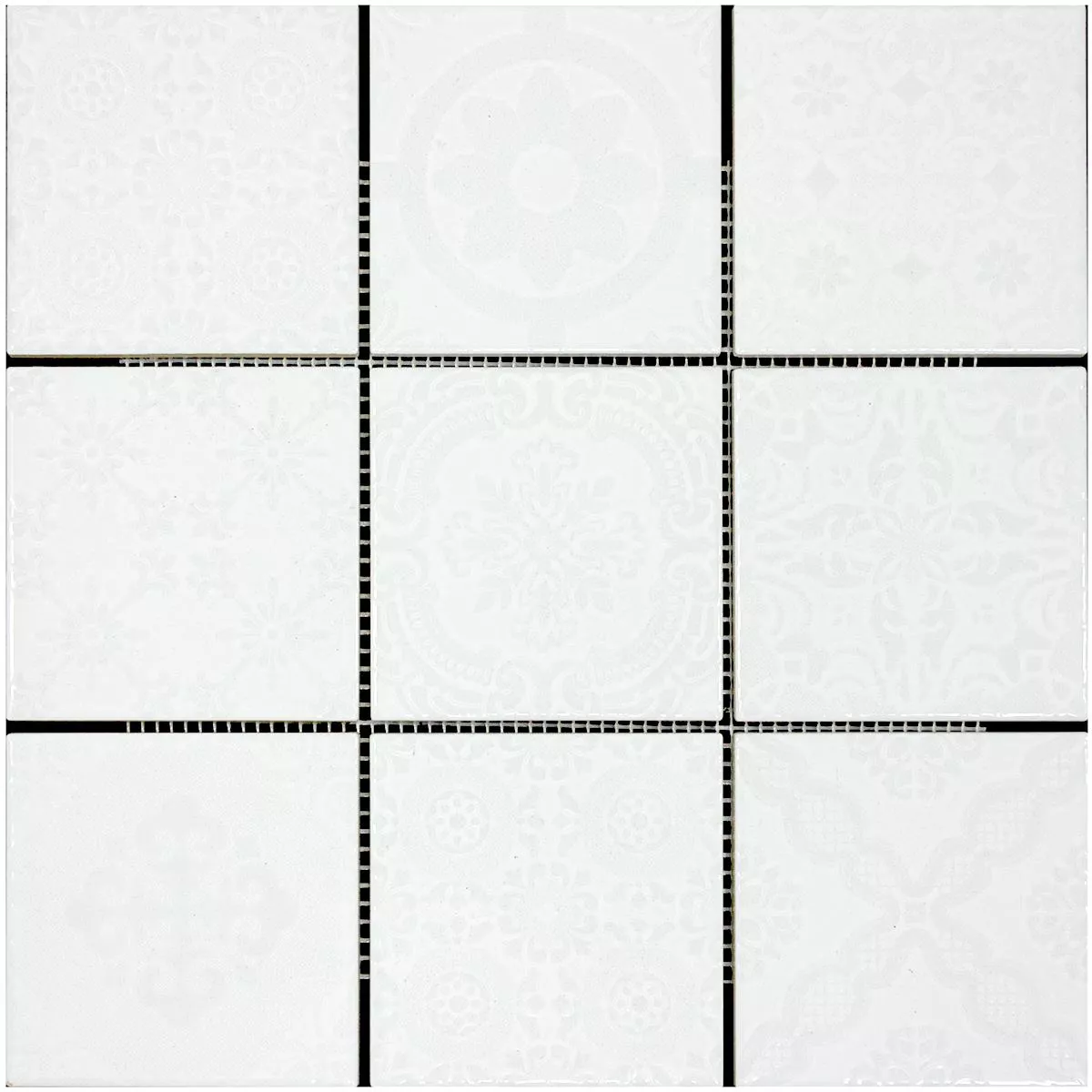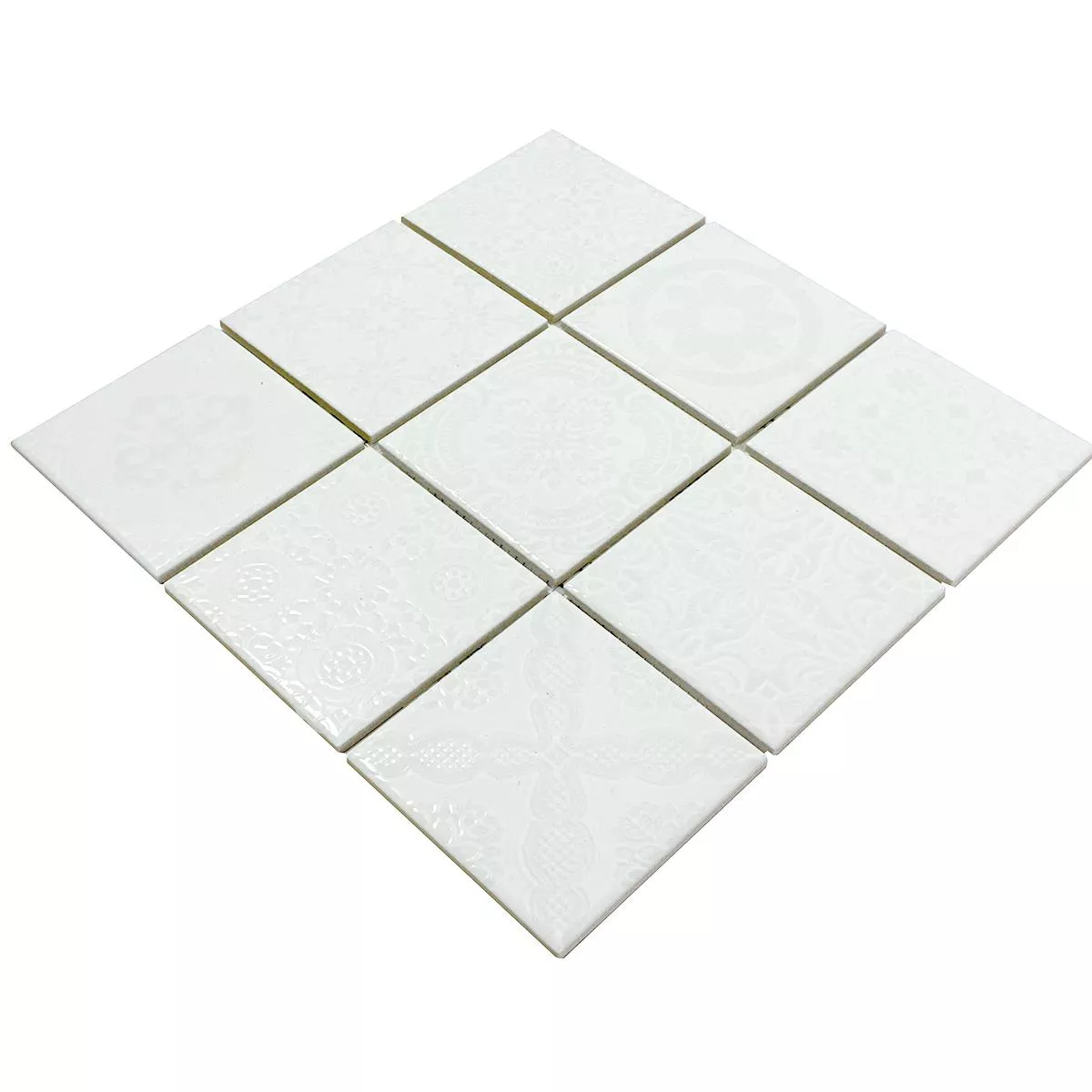 Discover a successful combination of retro chic and timeless elegance with our Rivabella Relief White ceramic mosaic tiles. These square floor and wall tiles with a stone size of 97x97mm give your living room, kitchen and bathroom a unique character. The glossy surface and the relief design create a special retro look.