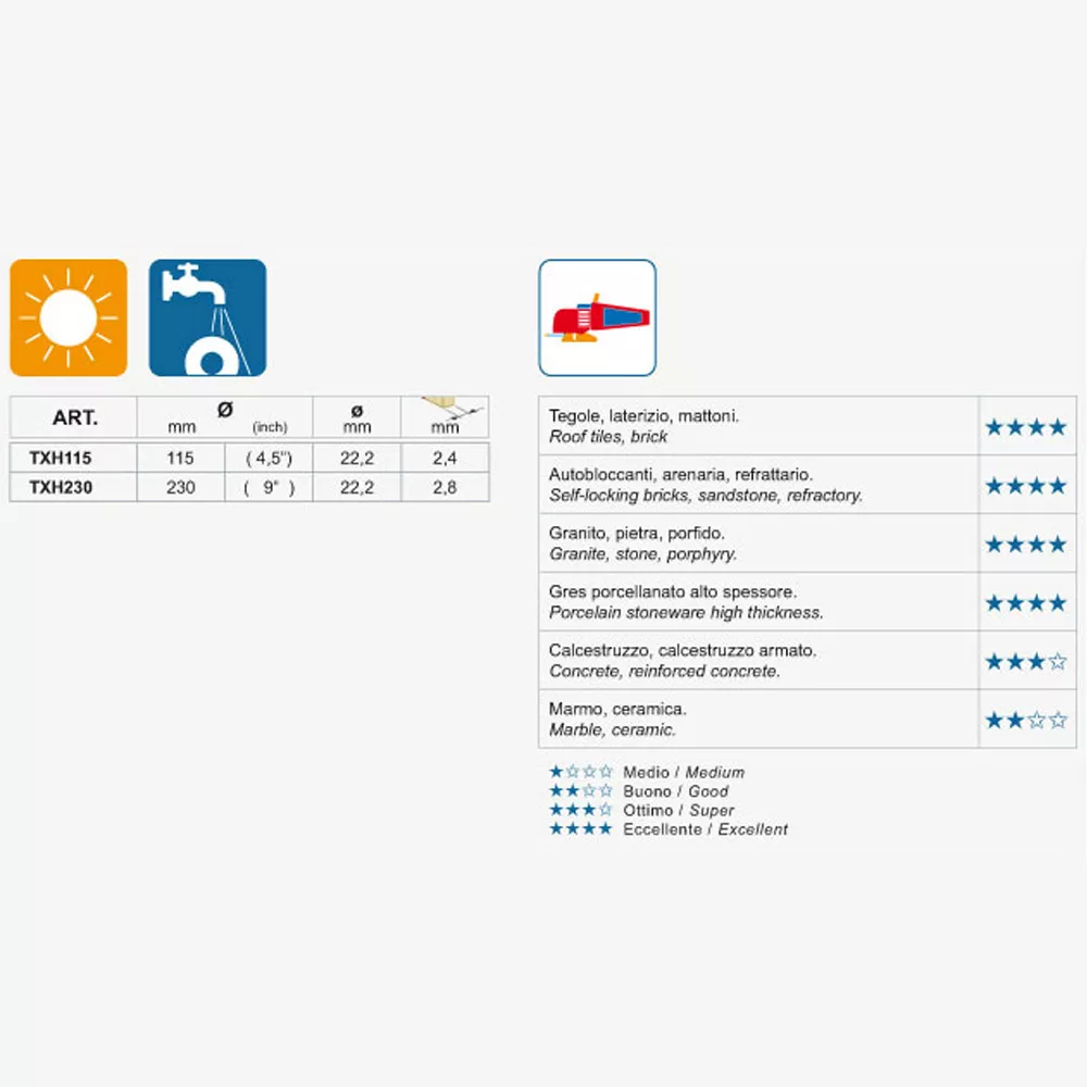 The long service life of the TXH tile cutting disc is achieved by the fact that diamonds that have become dull break out of the disc. The diamonds integrated deeper into the disc are then used. The actual abrasive is embedded in the homogeneous core layer of the disc. Since the cutting blade can withstand high thermal loads, the disc can also be used dry to process hard and thick tiles. A cutting disc suitable for dry cutting can also be used for wet cutting. If necessary, the diamond disc can be sharpened using the sharpening stone specifically offered by the manufacturer.