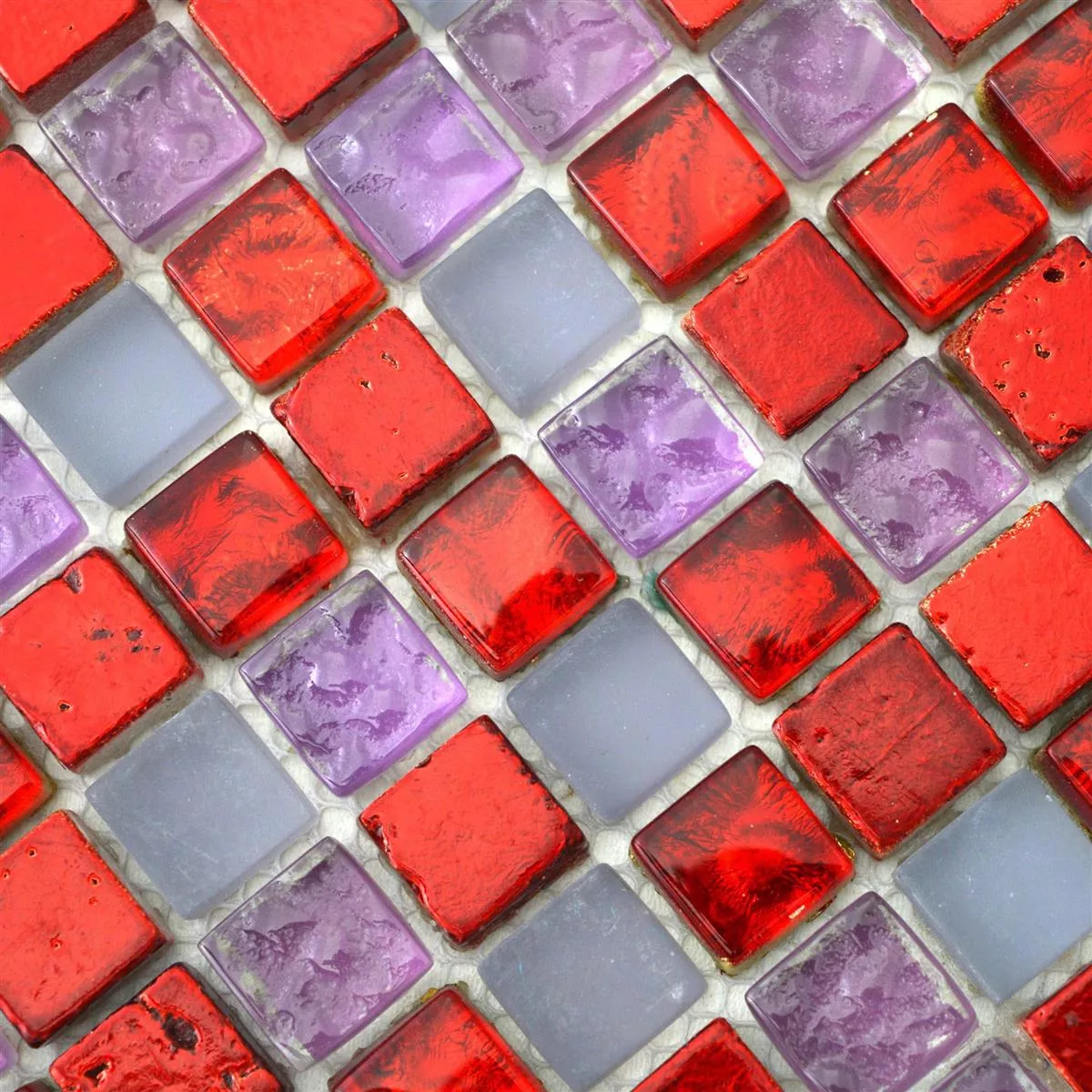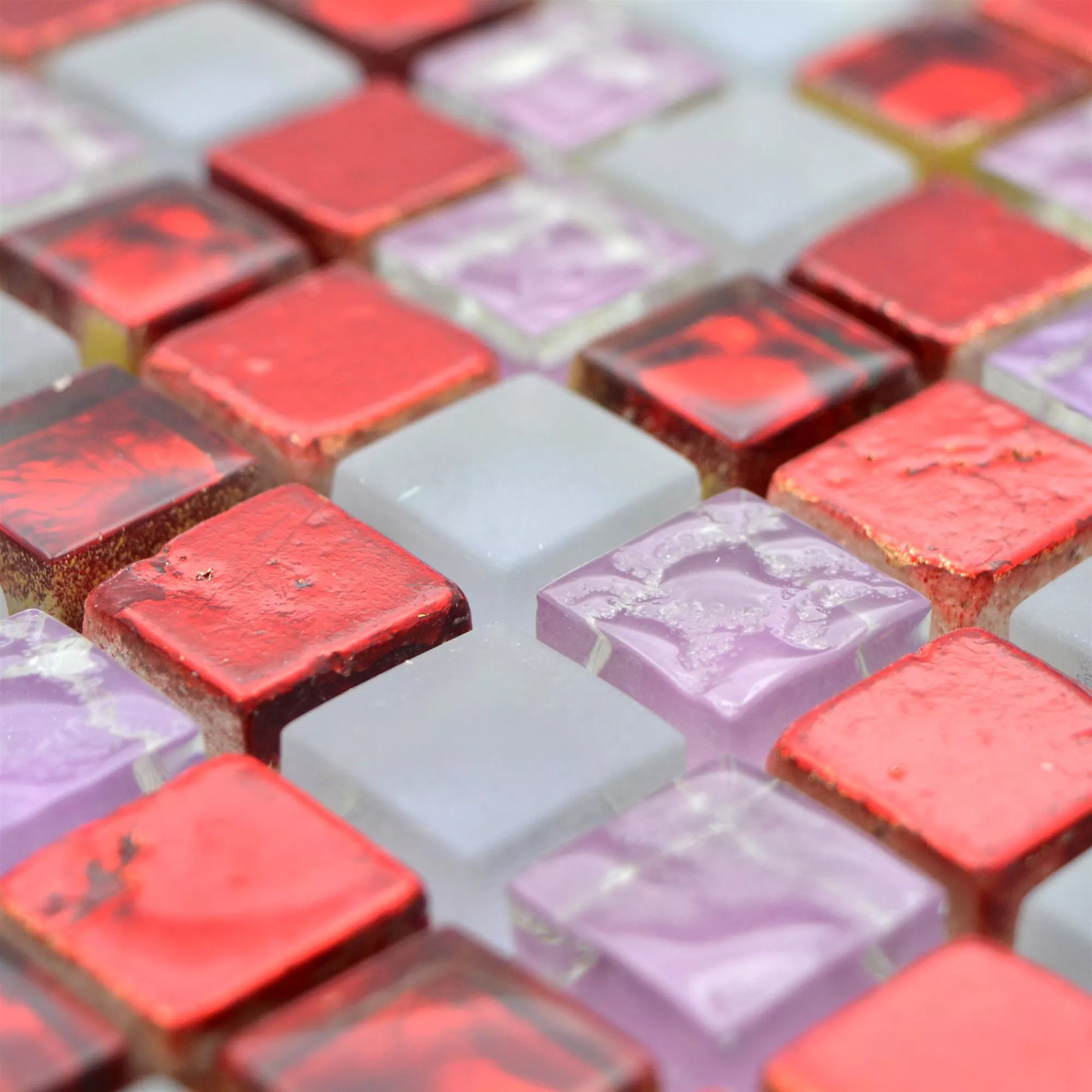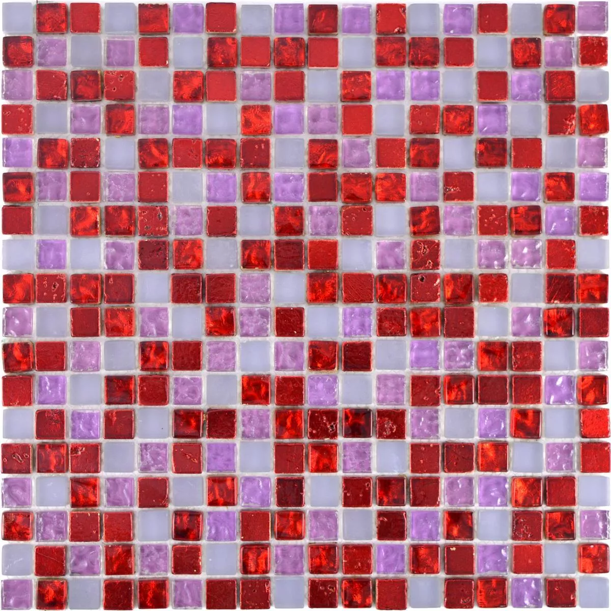 Cleopatra mosaic tiles in vibrant red, pink and white combine natural stone and glass to create a fascinating design that is both matte and glossy. These tiles are especially suitable for walls and offer an eye-catching, elegant look.