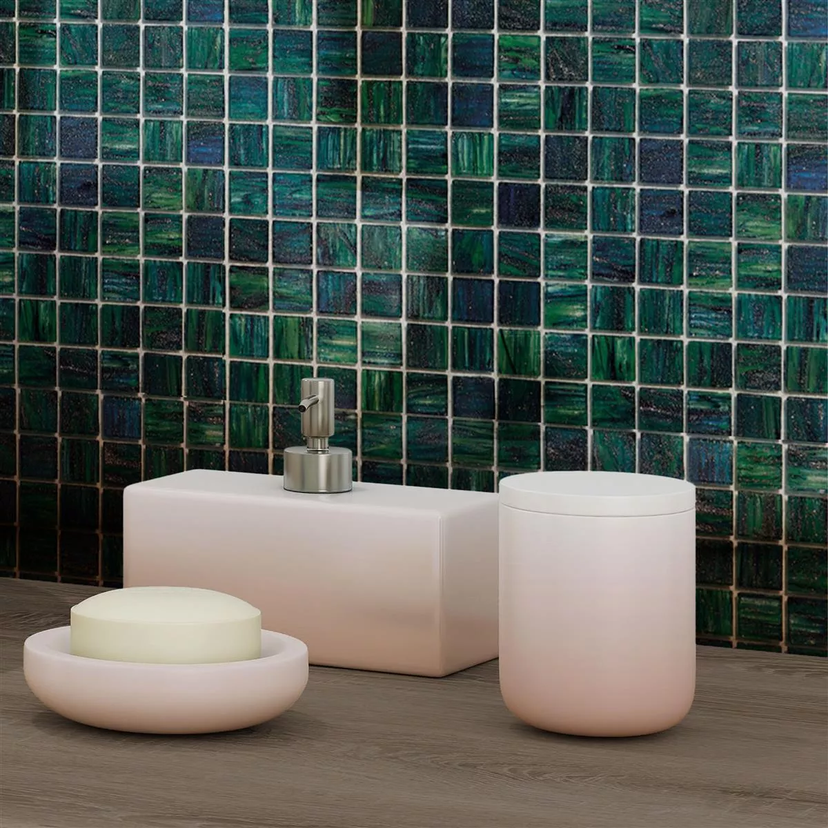 The Catalina glass mosaic tiles in a refreshing blue-green mix are the perfect choice to enliven your room with vibrant colors and modern shine.