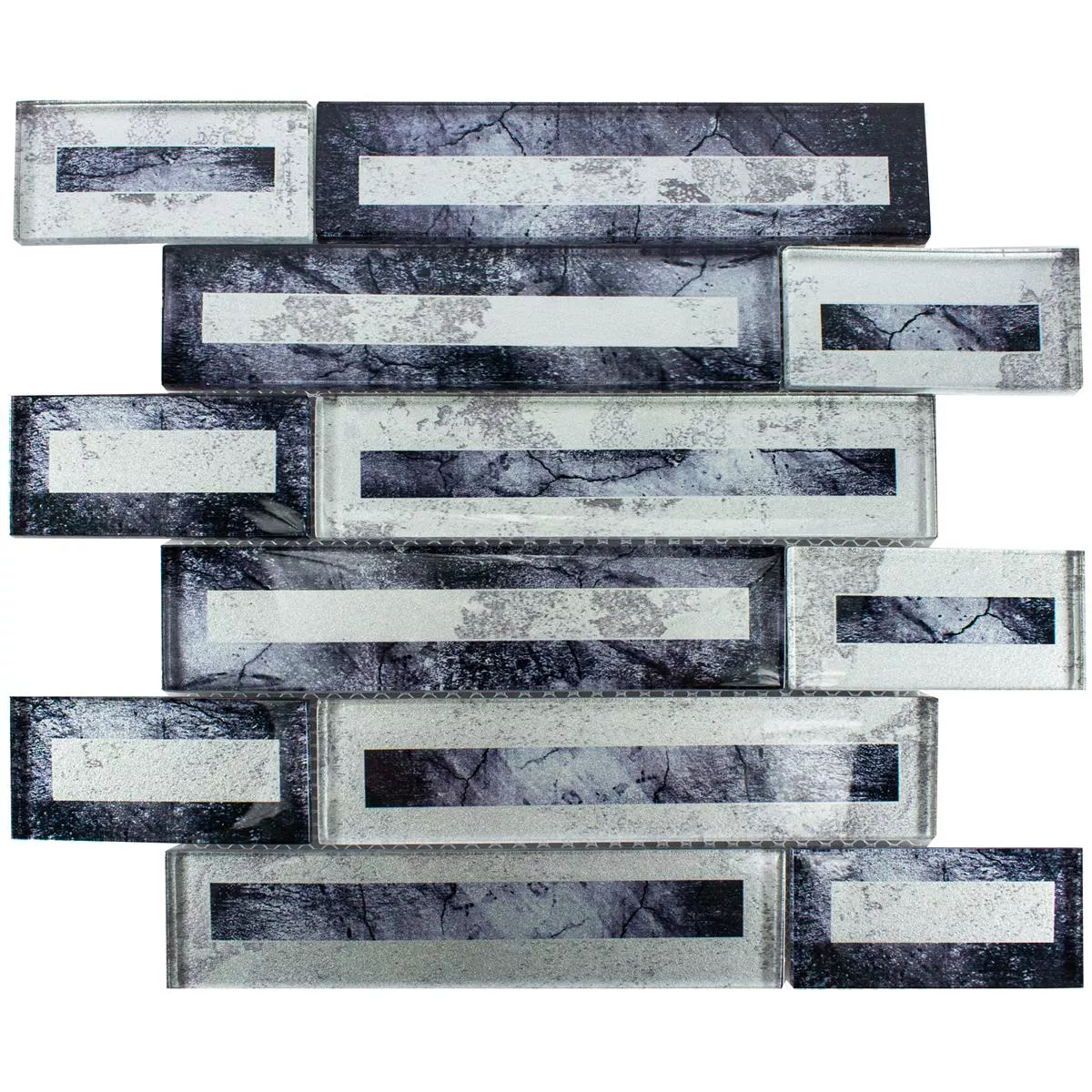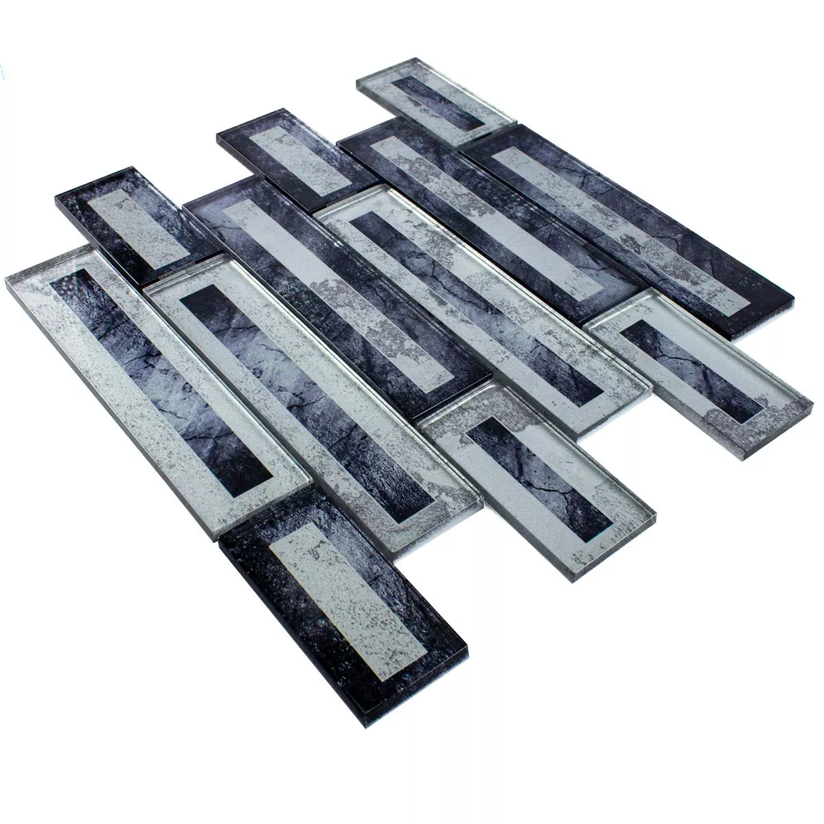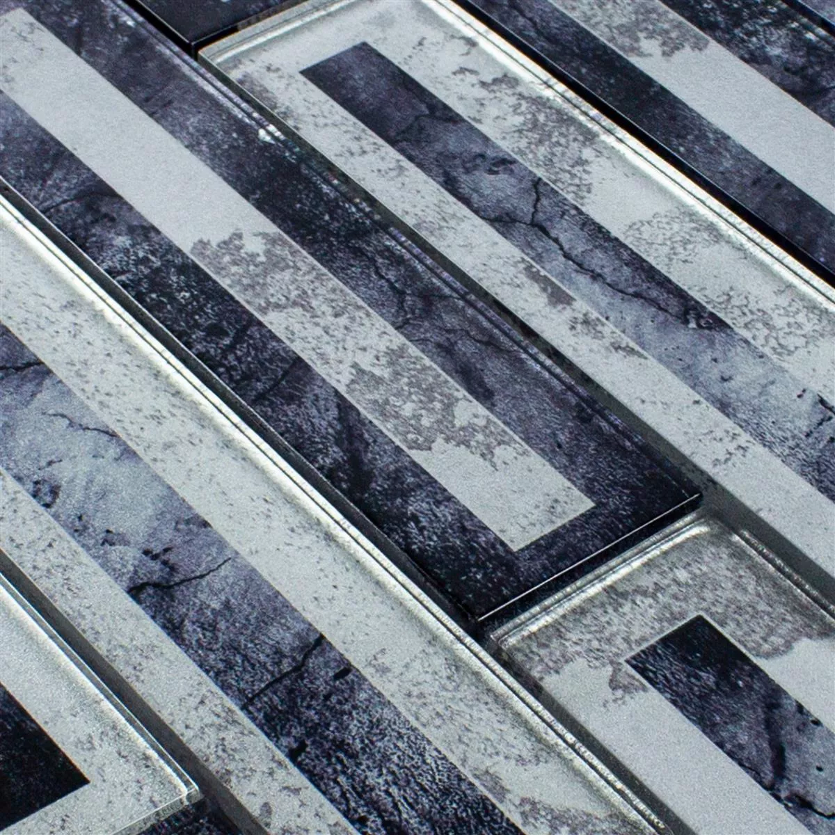 The Romans glass mosaic tiles in black and silver combine timeless elegance with modern functionality. The glossy 2D look and the high-quality glass materials create a luxurious look that stylishly enhances your walls.