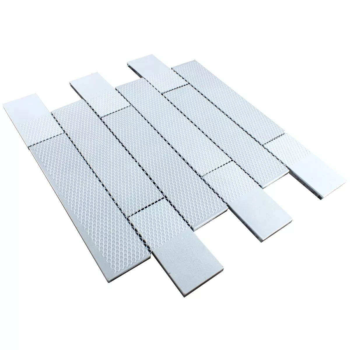 The mosaic tiles measure 48 x 98 mm and 48 x 198 mm and are arranged on mats measuring 30 x 30 cm. Each mat covers an area of 0.090 m² and is 8 mm thick, which ensures a robust and durable surface. The rectangular shape of the tiles allows for an elegant, geometric pattern.