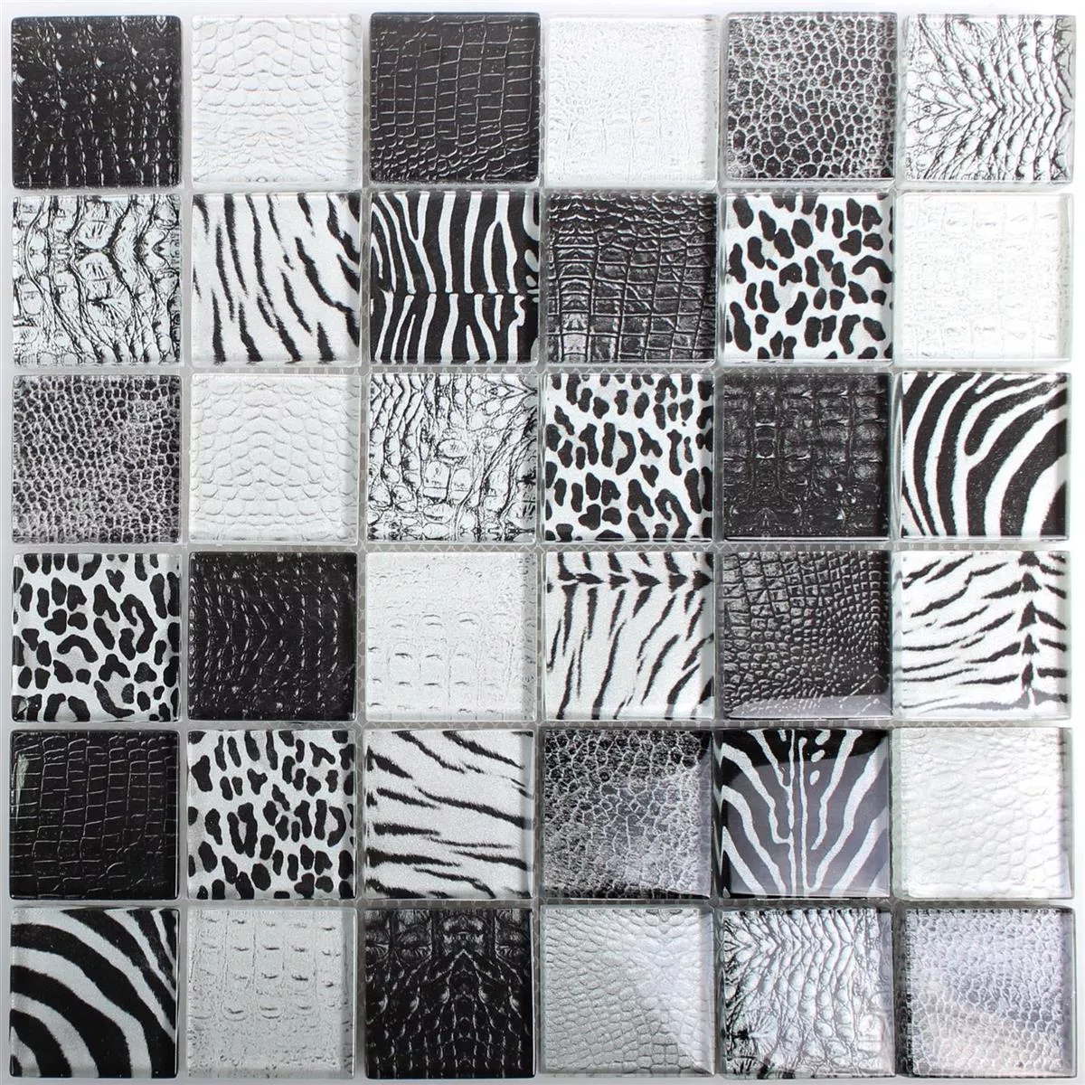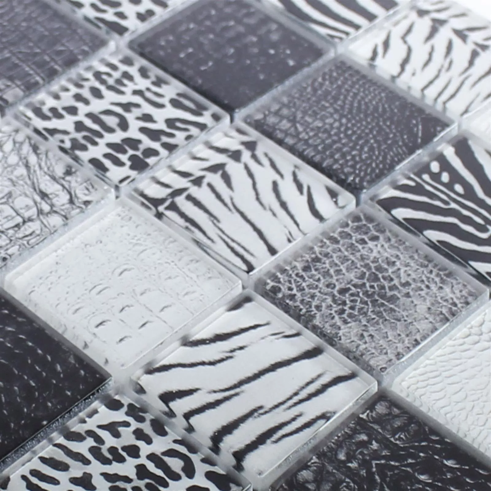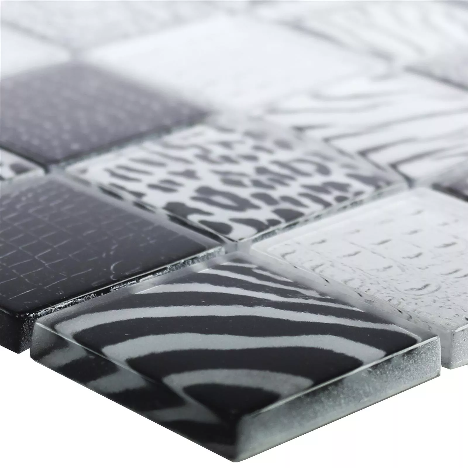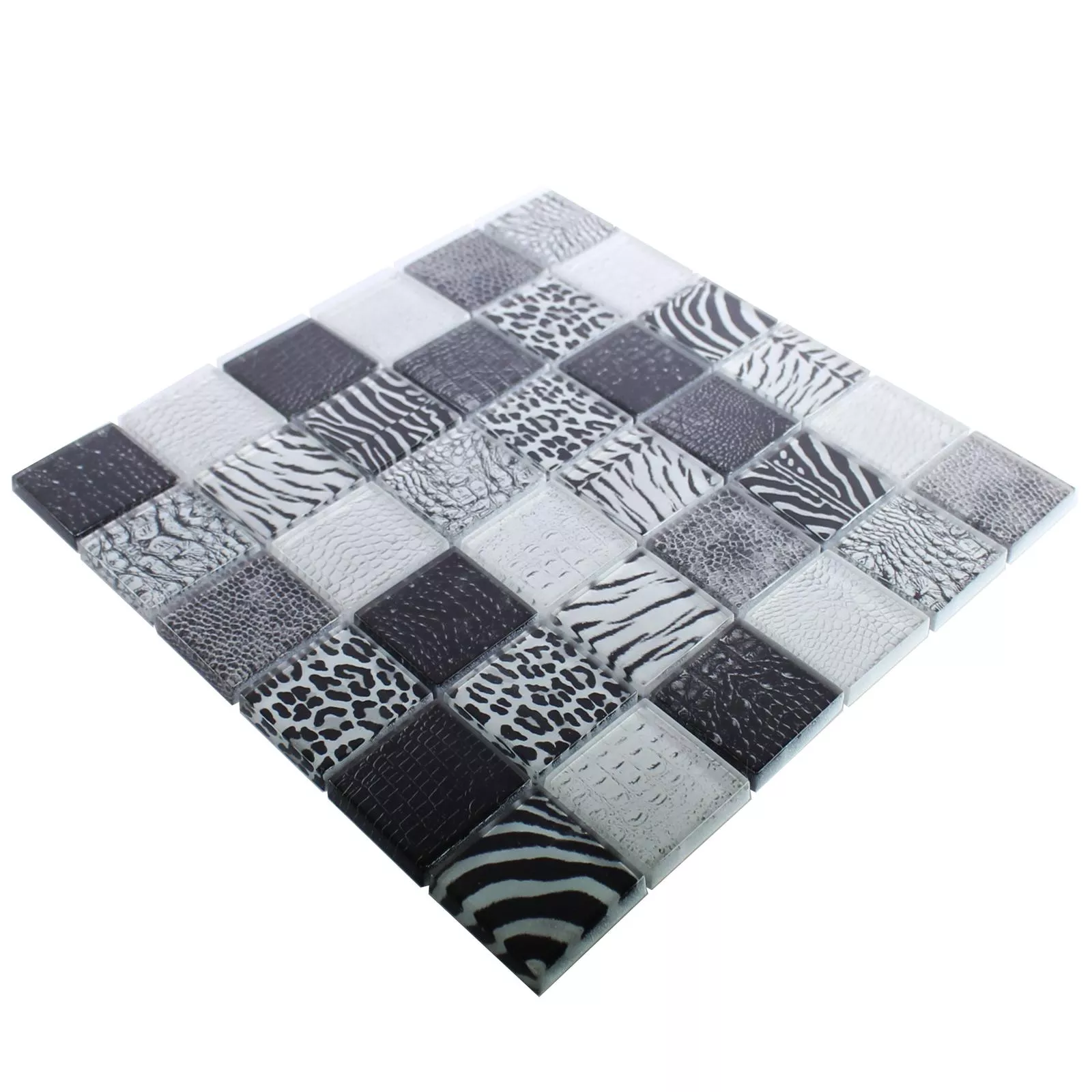 The square plates are made of glass. They are 48 x 48 millimeters in size and 8 millimeters thick. The tiles have a glossy finish that adds elegance to their surroundings. The tiles are neatly glued to a fine mesh and can therefore be laid by yourself.