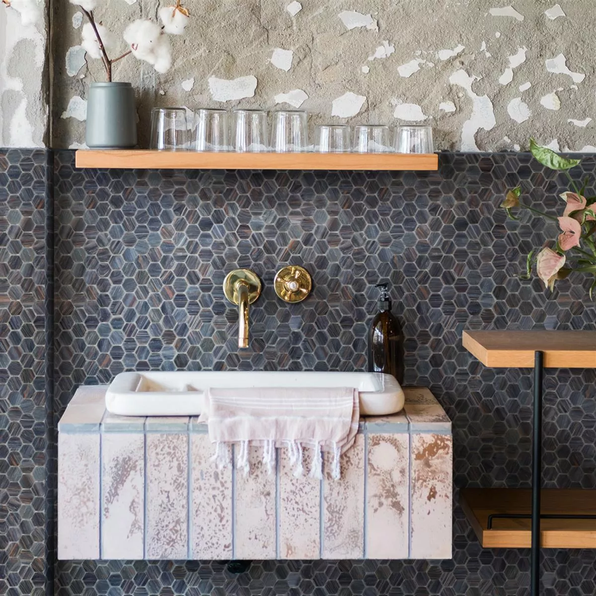 The Hexagonal series tiles are made from 59% recycled glass, making them an eco-friendly choice for your home. They are waterproof and frost-resistant, making them a perfect choice for outdoor areas and permanently wet areas. They are also bonded to a polyurethane mesh backing for easy and secure installation.