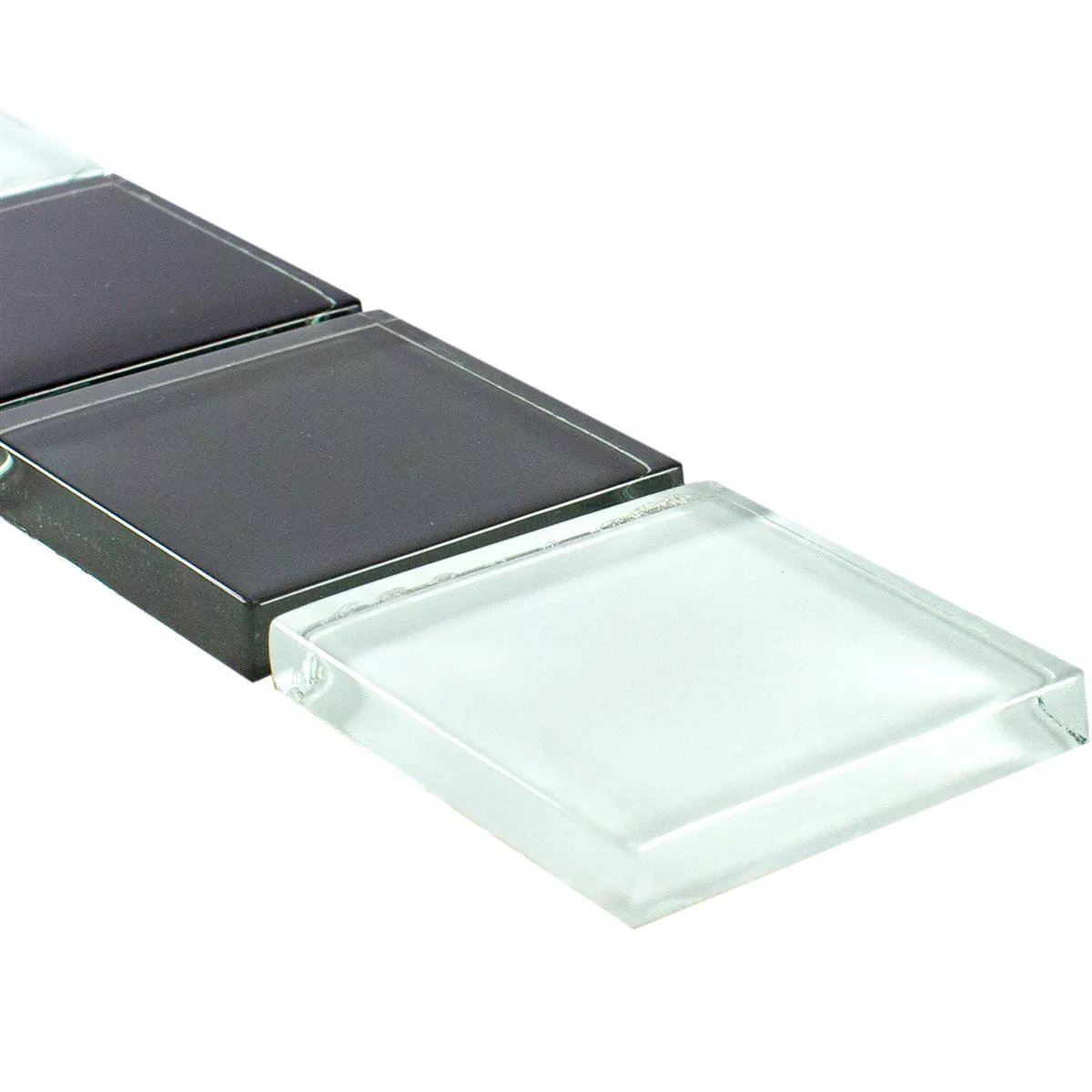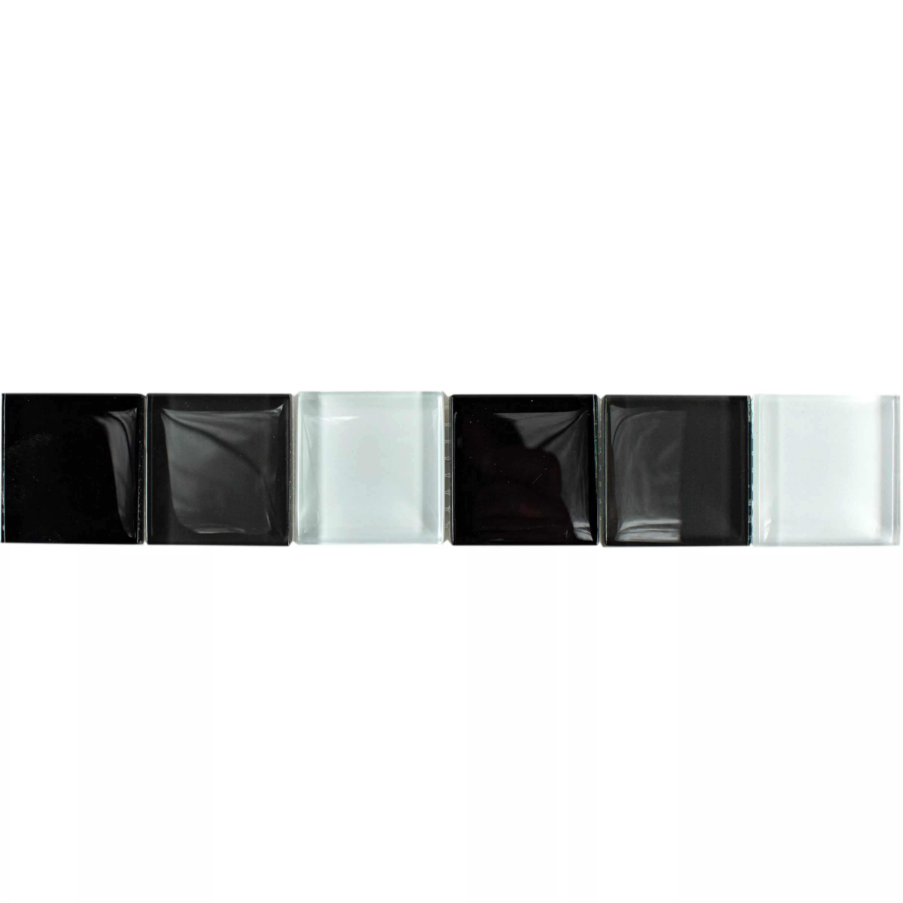 The glass tile border Exira in the colors grey, black and white is a square tile border with a stone size of 48x48mm. The surface of the tiles is glossy and the tile or mat size is 4.8x30cm. A single mat has an area of 0.015m². The thickness of the tiles is 8mm.