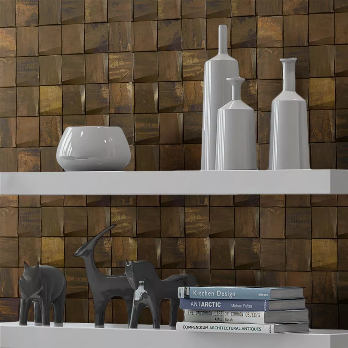 Made from high quality copper and metal, these tiles not only guarantee durability but also an impressive visual impact. Their area of application extends from the living room, the kitchen to the bathroom, and they are particularly suitable for indoor use. However, please note that they are not suitable for wet areas.