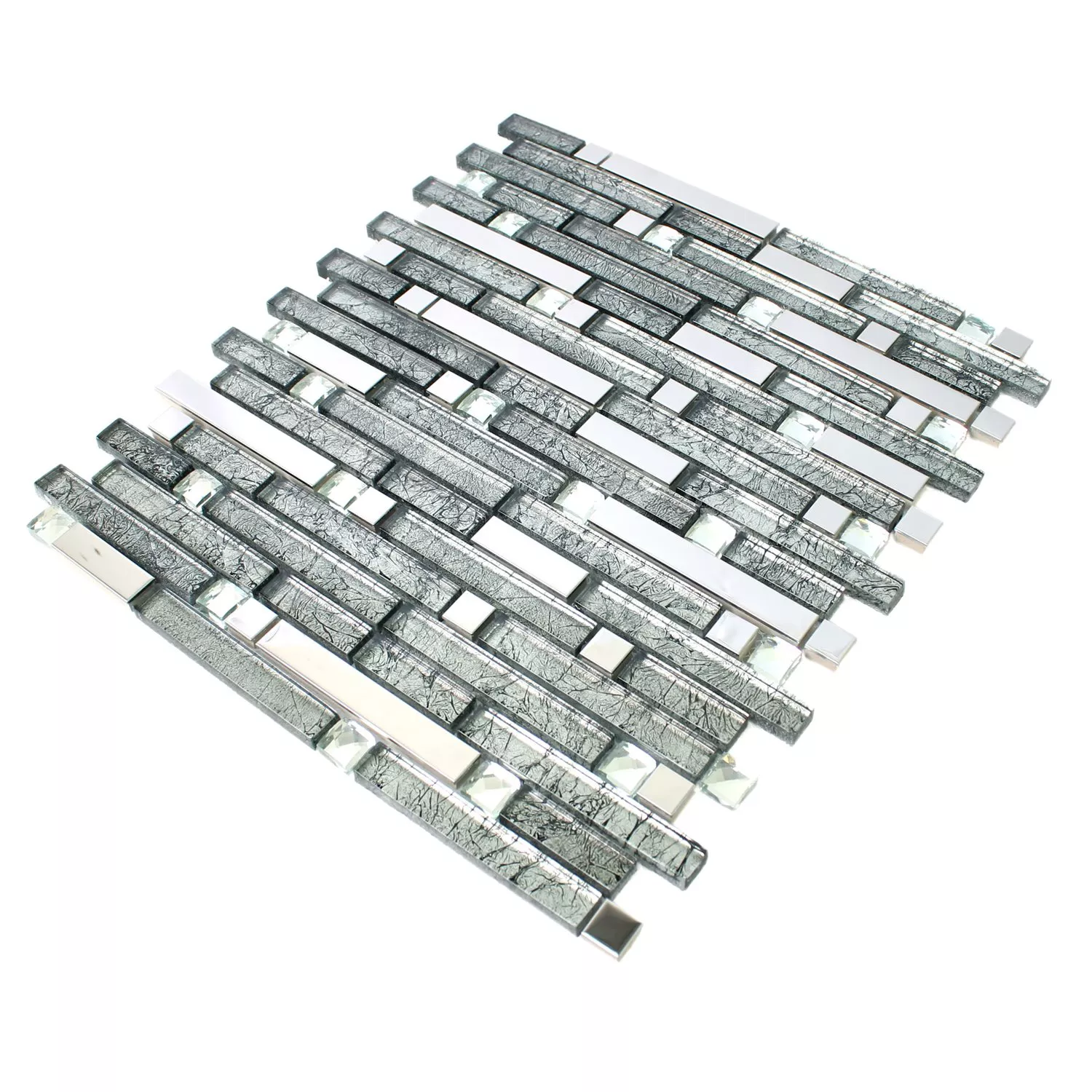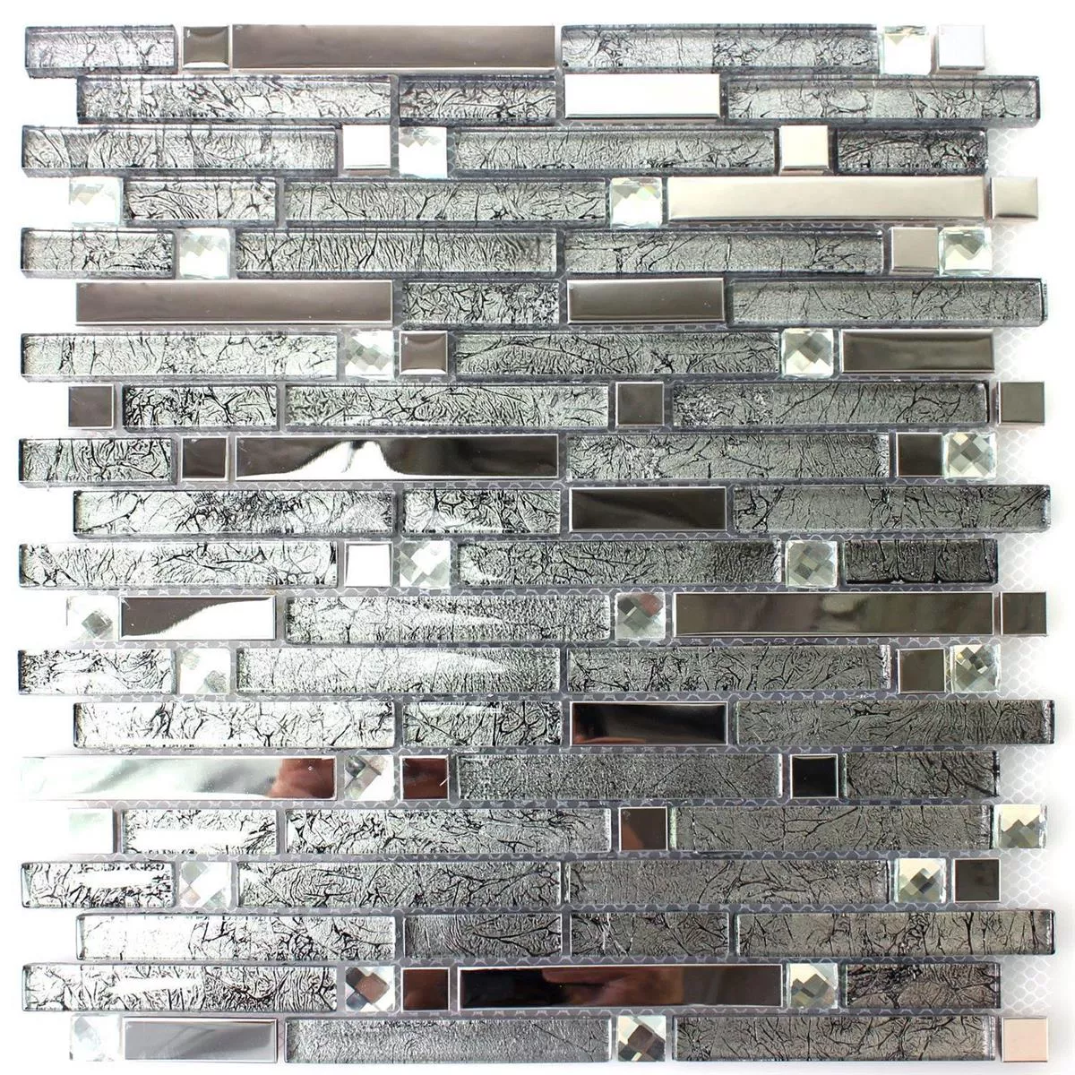 The mosaic tiles Daphne Silber Diamant are the ideal companion for the modern apartment. As a chic wall tile, they fit into different rooms. There are no limits to creativity here. You can cover an entire wall with these tiles or individual sections as a shelf finish or for better structure in the bathroom. The tiles are cut square and glued to a backing mat. The tiles can be optimally processed with this mat.