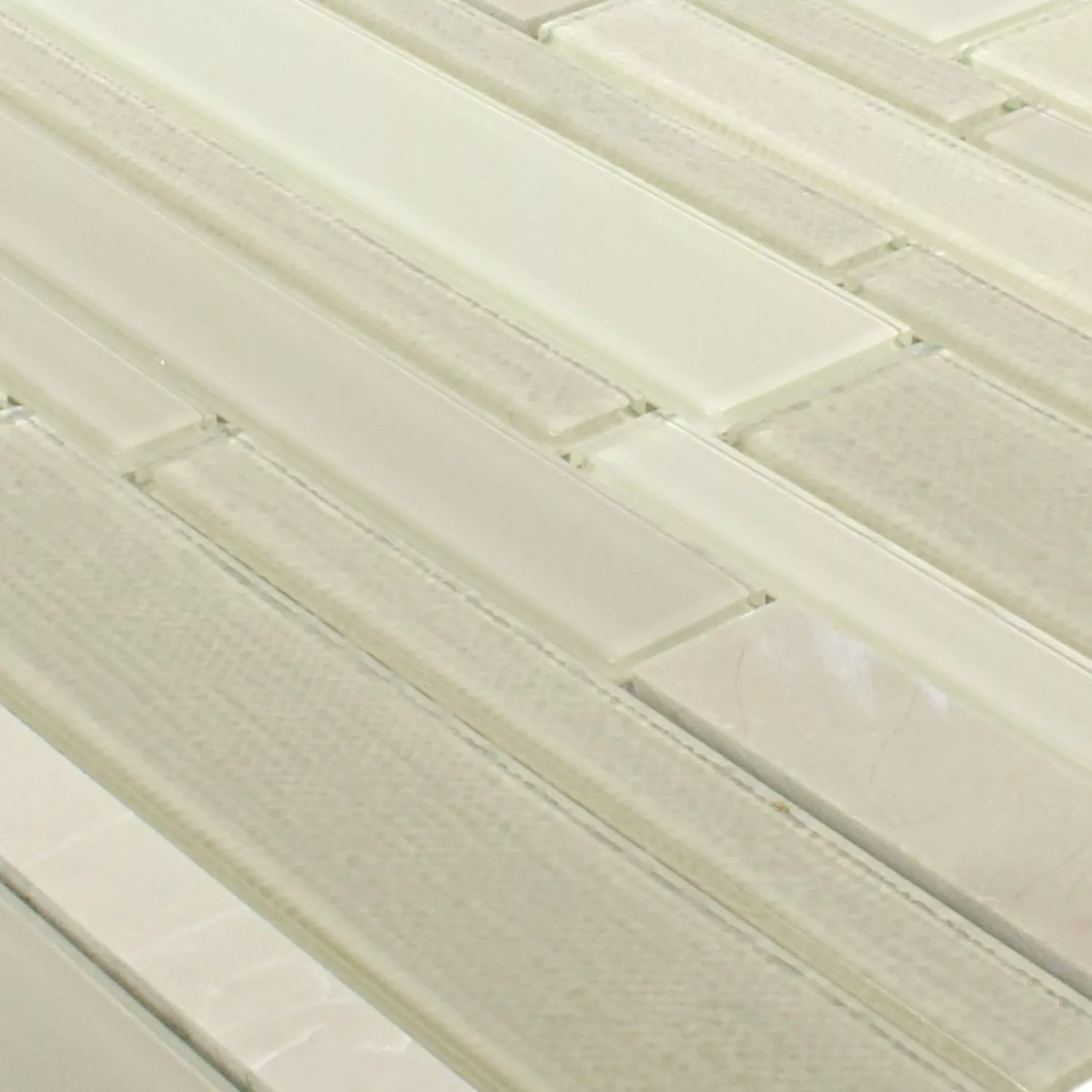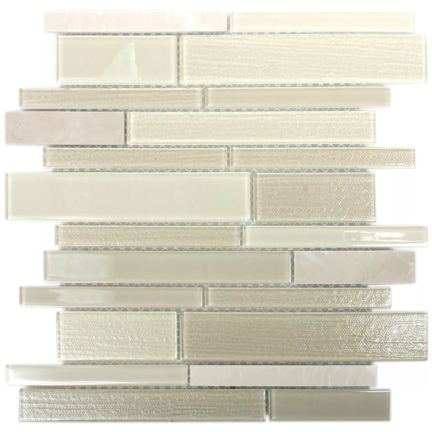 The mosaic tiles Glas Naturstein Kalamos Beige turn every room in which they are laid into a very special oasis. These tiles have been provided as a glass mosaic with natural stone elements and will fit perfectly into the bathroom. The tiles themselves vary in size and have a very special surface pattern. The structure on the glass tiles is smooth and the structure on the natural stone tiles is roughened. But the tiles are still shiny and come into their own in your bathroom. You can lay the glass mosaic with the natural stone tiles in your shower.