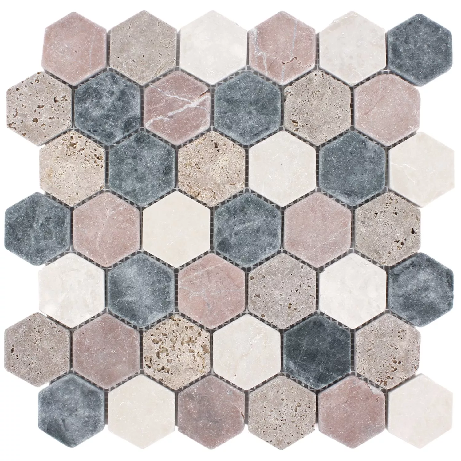 The mosaic of this natural stone tile Tarsus Bunt consists of hexagon-shaped marble stones. They are available in four different surface patterns that can be easily combined with each other. This results in design options that give your apartment a very personal touch.