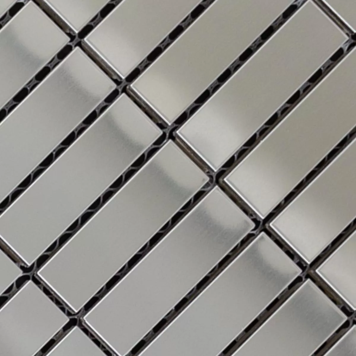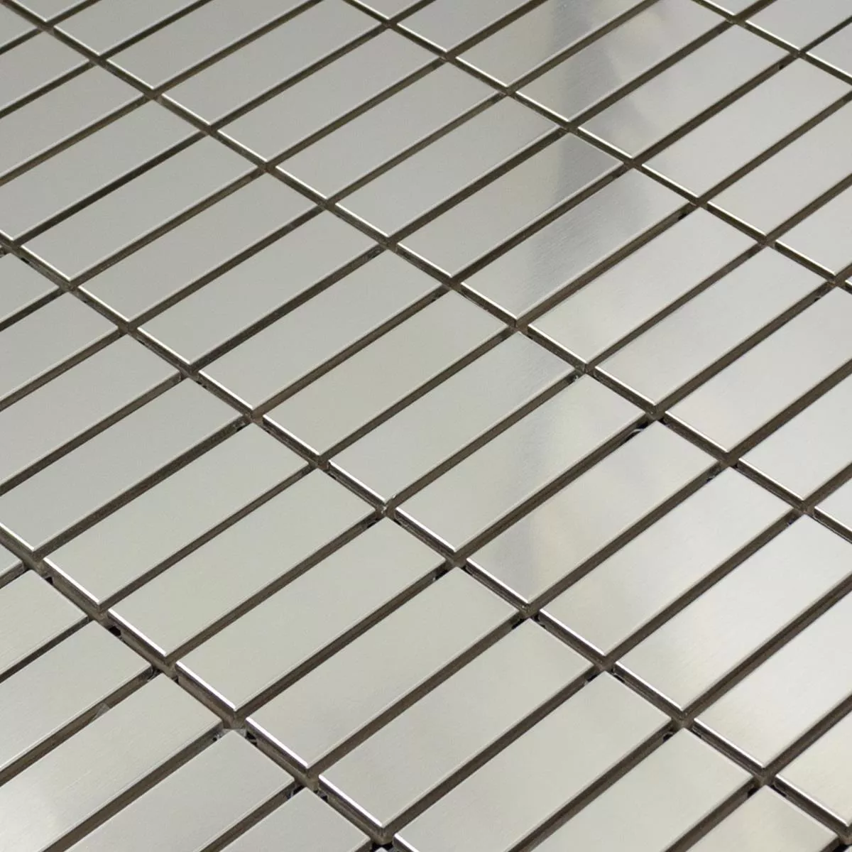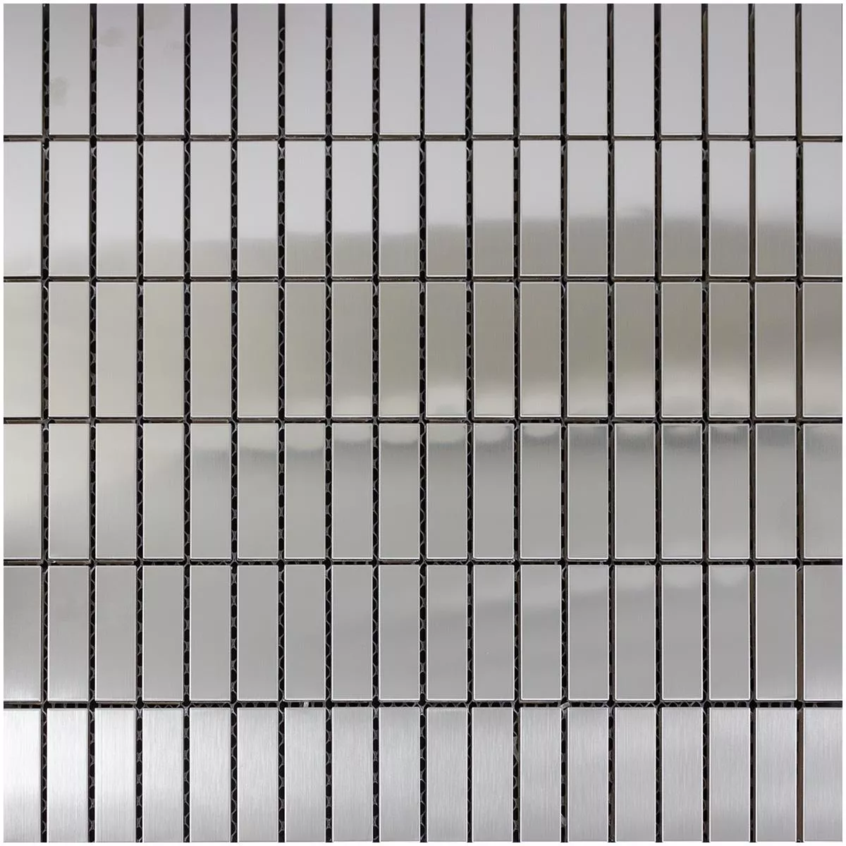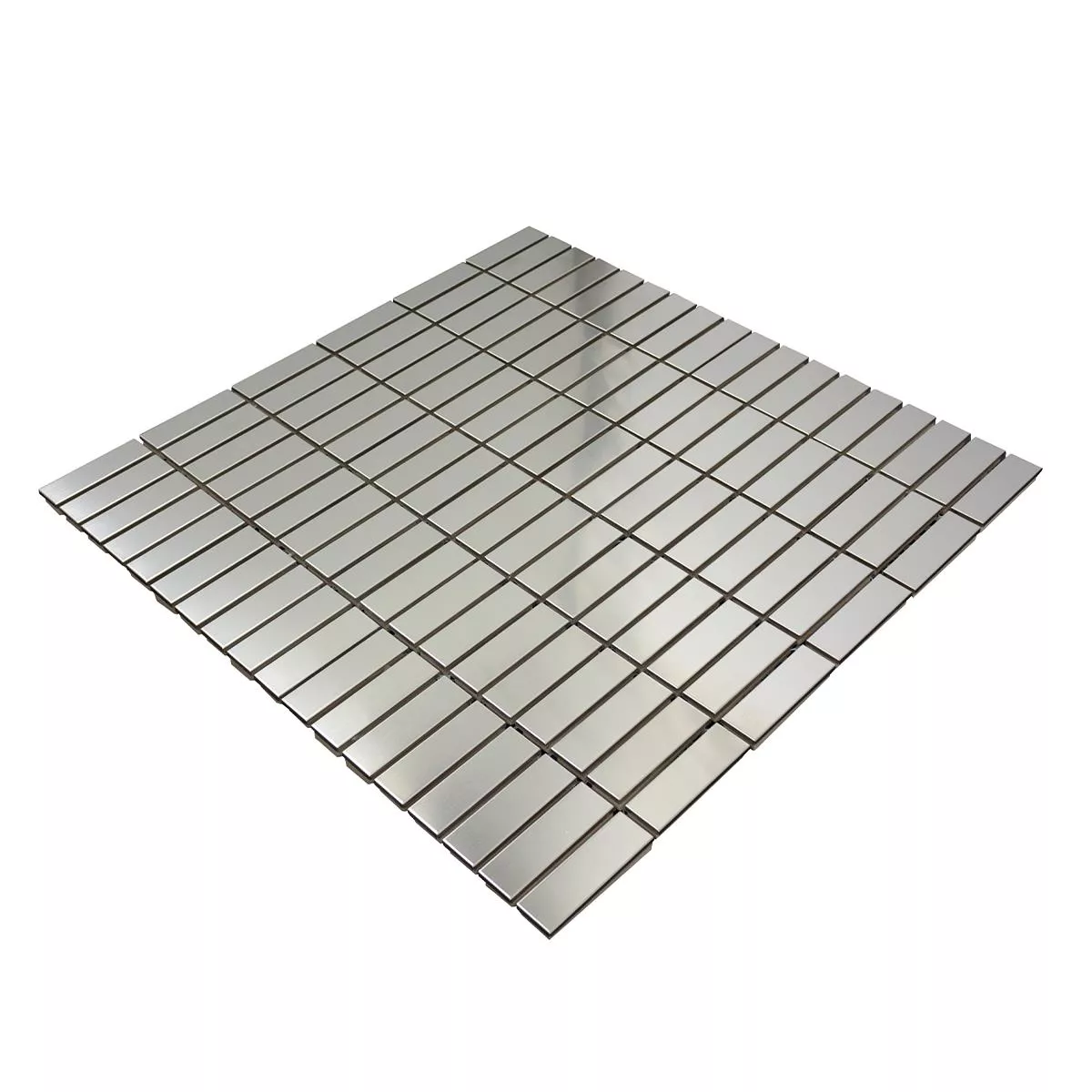 The tiles in stick format have a total size of 29.8 x 30.5 cm and consist of individual stones in the practical size of 15 x 48 mm. The brushed and shiny surface in a timeless silver color ensures an elegant appearance and a pleasant play of light and shadow.