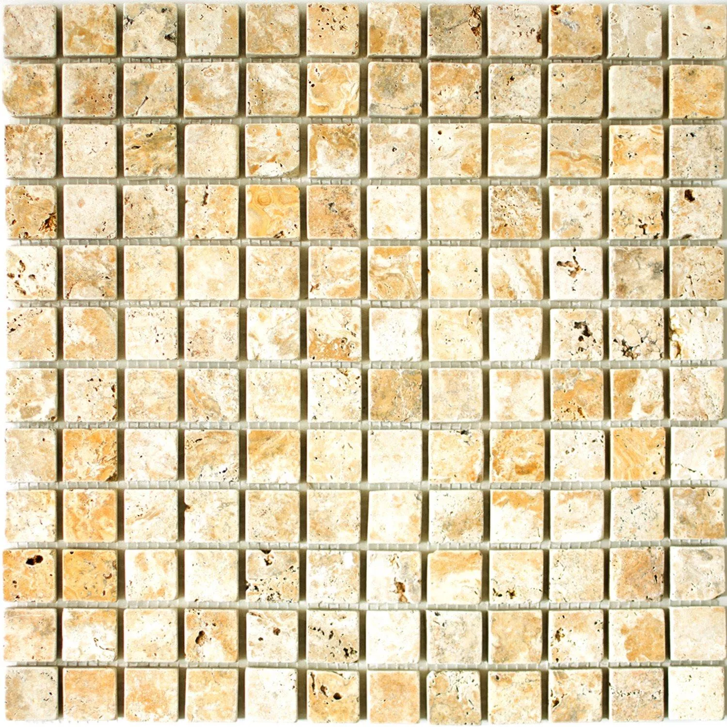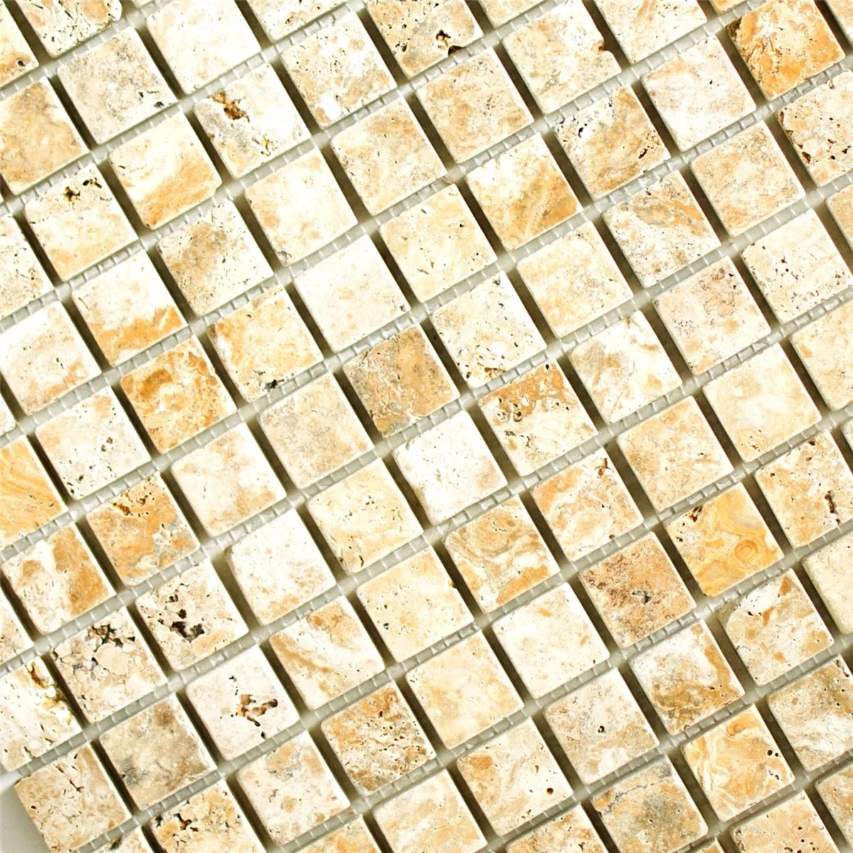The mosaic tiles Travertin Castello Gold 23 are a natural product. Travertine, the stone from Tivoli, has a particularly maritime charm and its porous surface makes this natural product so attractive. These tiles, labeled Travertine Gold, also have a certain golden sheen to the beautiful color scheme. These are natural tiles that also act with naturalness and their lively surface.