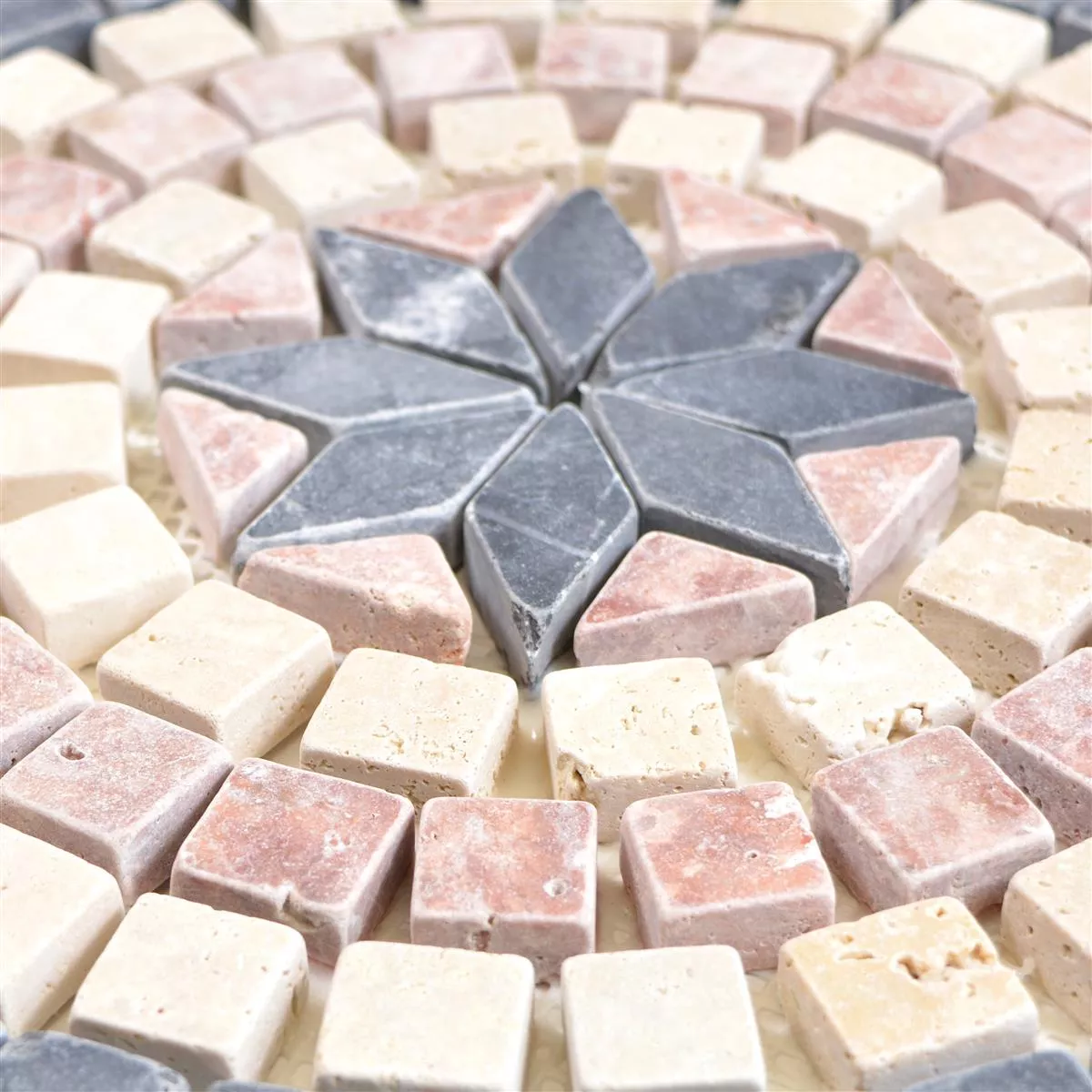 The tastefully crafted mosaic tile Rosone Buxton is made of natural travertine stone and impresses with an elegant color combination of beige, black and pink, as well as an interesting, circular pattern. The matt surface finish gives the tile an antique look, which gives the living environment an extraordinary touch. The tile is both non-slip and frost-resistant, so it can also be used on the terrace.