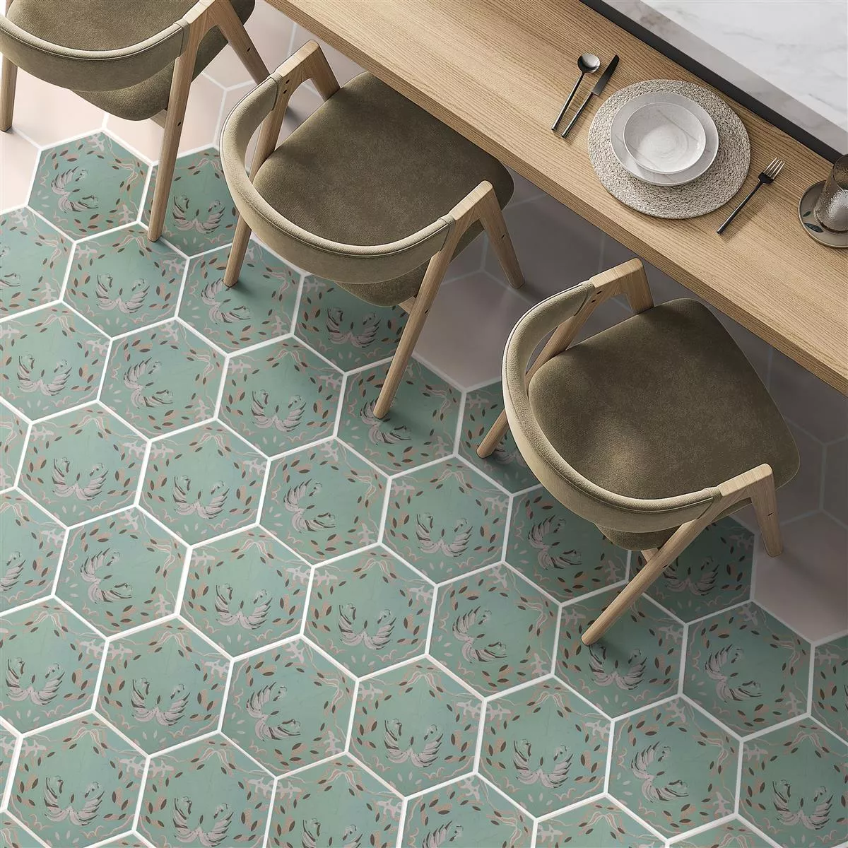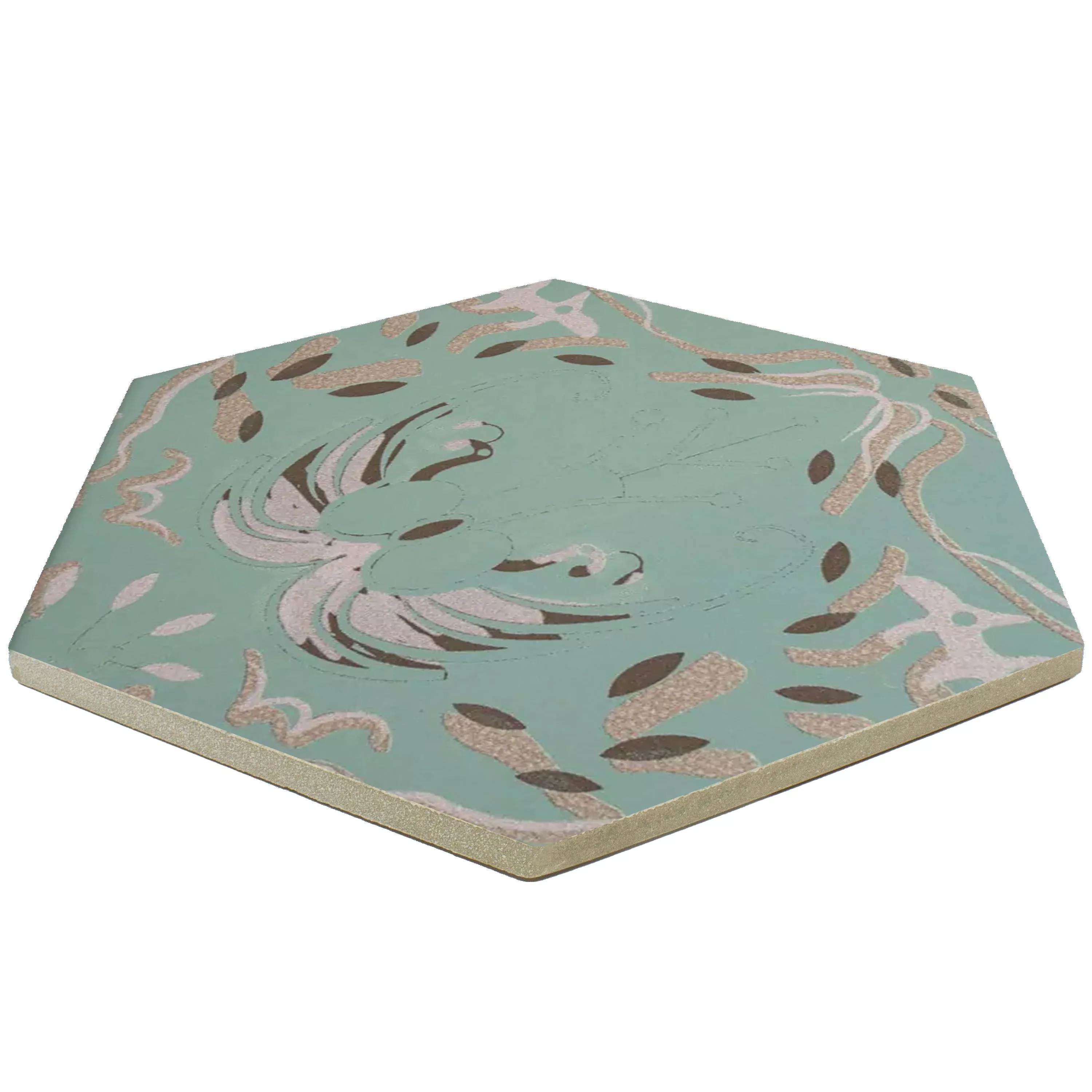 The “Modena Hexagon Decor 5” porcelain stoneware tiles offer a harmonious fusion of functionality and aesthetic design. With a thickness of 10mm, they are ideal for wet areas, showers, bathrooms, kitchens, living rooms and indoor areas. The matt surface and the floral ornament motif in green give the tiles a timeless elegance.