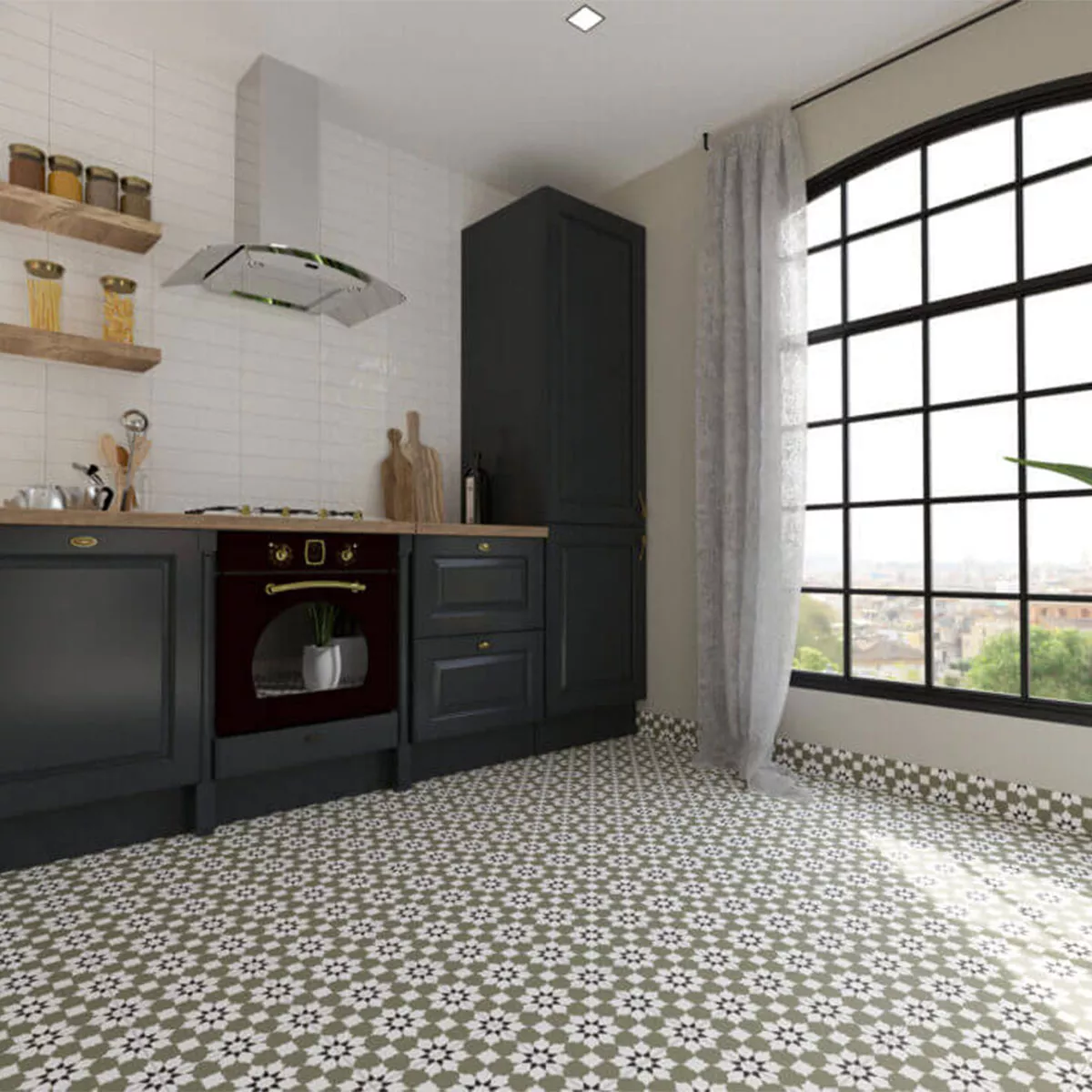 Transform your home into an oriental oasis with the Samarkand Green porcelain stoneware tiles (22.5 x 22.5 cm). These tiles impress with their fascinating design in green and white tones and their high functionality.