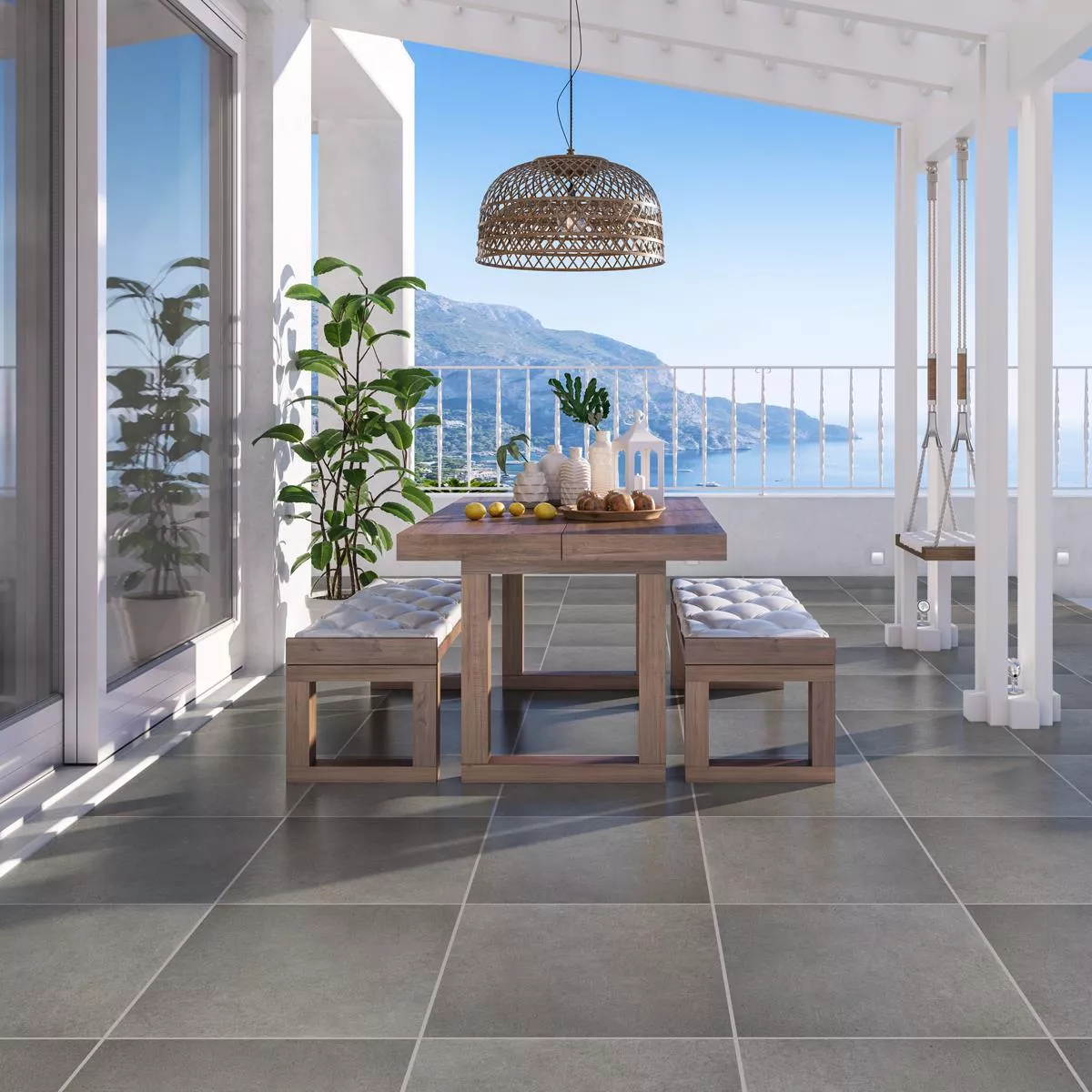 The Panama Dark Grey 60x60x2 cm concrete look porcelain stoneware patio tiles are the ideal choice for stylish and robust flooring in your outdoor and indoor areas. These square tiles in dark grey impress with their contemporary concrete look and a matt surface that creates a modern aesthetic.