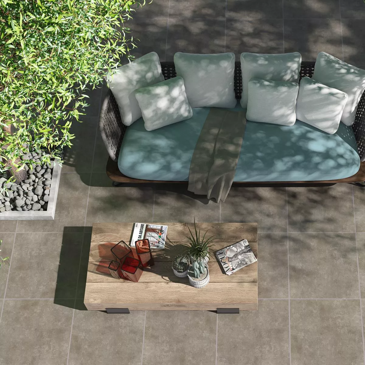 The rectified edges allow for seamless installation with minimal joint widths, while the glazed surface provides additional protection against stains and makes cleaning easier. With a slip resistance of R11, these slabs offer increased safety, especially in wet areas such as bathrooms or showers. The versatility of these patio slabs makes them an excellent choice for numerous applications. They are suitable for both indoor areas such as living rooms, kitchens, bathrooms and showers, and outdoor areas such as terraces, balconies and walkways.