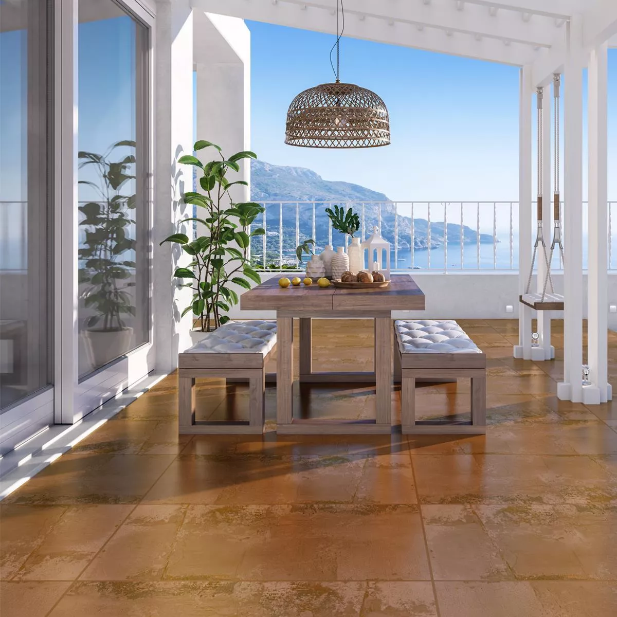 Die Terrassenplatten Feinsteinzeug Calabria Iron Braun sind die ideale Wahl für eine moderne und langlebige Gestaltung von Außenbereichen wie Terrassen, Balkonen und Gehwegen. Diese hochwertige Bodenfliese besticht durch ihre robuste Bauweise und die ansprechende Metalloptik in der Farbe Braun. Mit einer beeindruckenden Größe von 100 x 100 cm und einer Stärke von 20 mm bieten diese Platten sowohl Langlebigkeit als auch Widerstandsfähigkeit. Ein Paket enthält eine Platte, die eine Fläche von 1 m² abdeckt.
