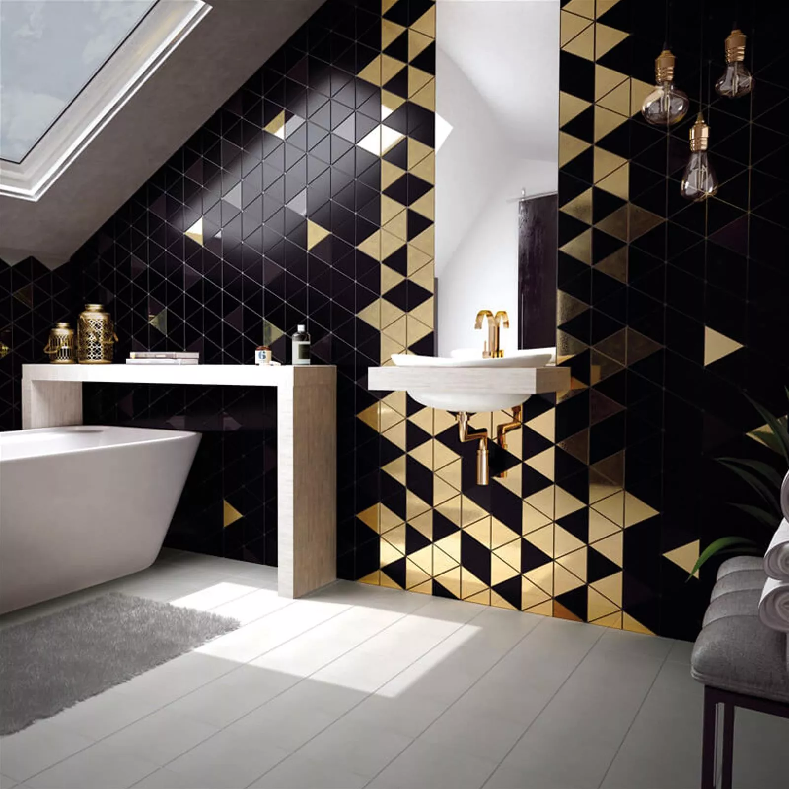 With a size of 10.8x12.4cm, the exclusive Britannia wall tile not only impresses with its triangular shape. The robust tile is 9.3mm thick and is suitable for many creative projects, preferably indoors. The material is earthenware. It is available in the colors blue, cream, gold, gray, light blue, light gray, mint, black, white and beige and is an eye catcher in every room.