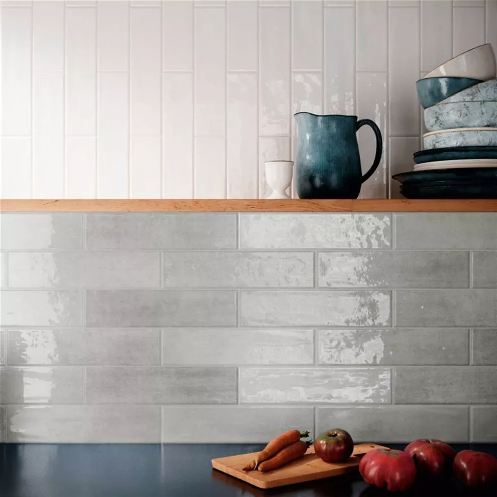 These glazed rectangular tiles measuring 7.5x30cm and 8.4mm thick bring a vintage aesthetic to your rooms. The wavy, glossy surface gives your walls a subtle dynamism.