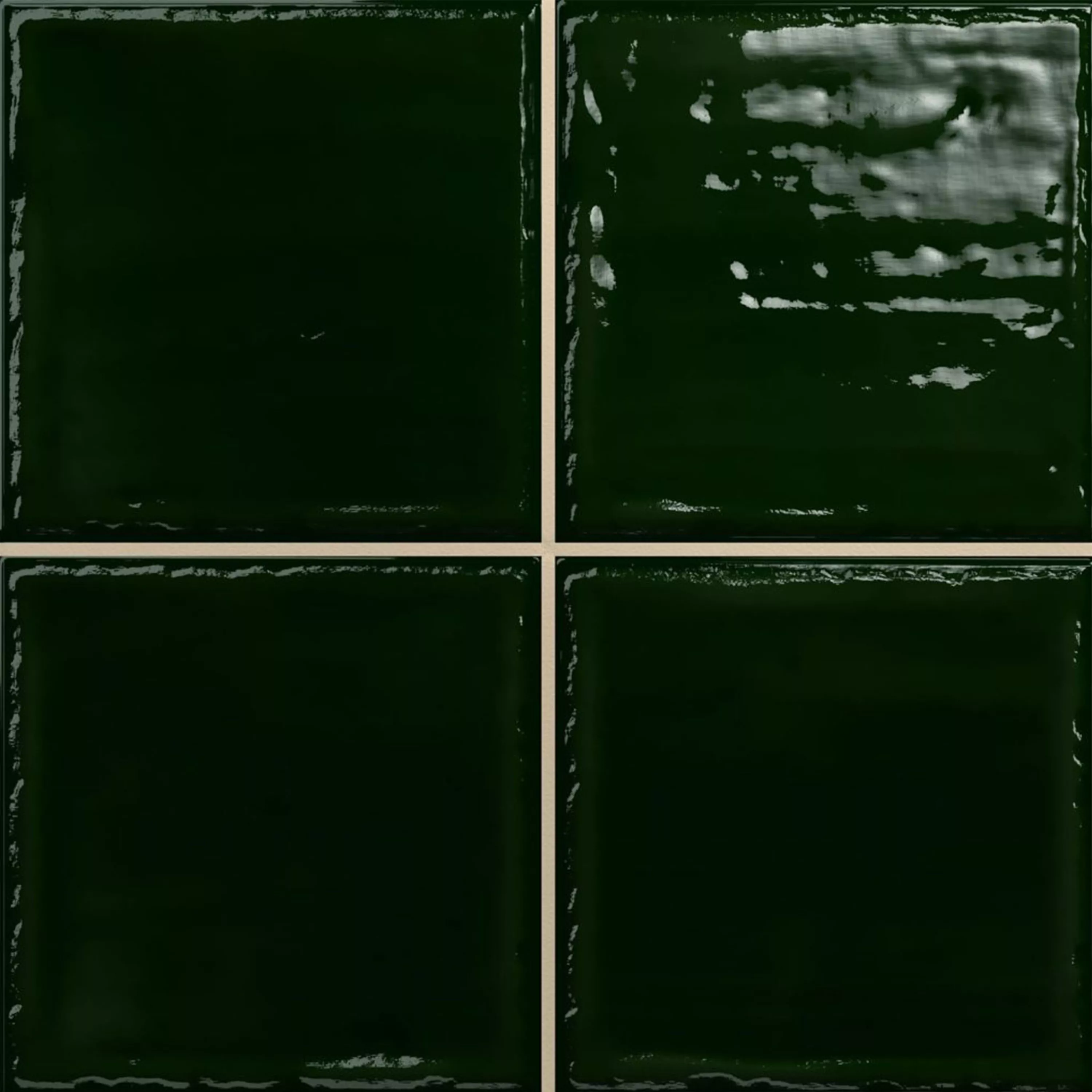The Verbania wall tiles in dark green, measuring 20x20cm and 7.8mm thick, bring a vintage look to your rooms. The glossy surface and dark green color scheme create an elegant atmosphere.